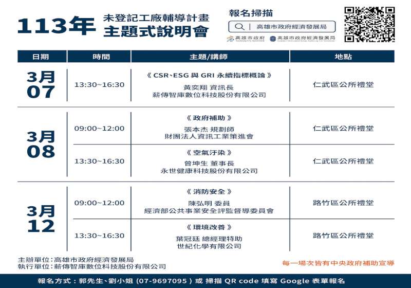 高市經發局3月續辦5場特登工廠說明會,首場3月7日在仁武區公所舉行,3月8日、12日在仁武及路竹區公所接力邀參,邀請各領域專家說明企業永續經營、環保及消防法規、工廠相關設備改善建議及補助計畫,期能協助業者導入低碳、智慧化設備,降低空氣污染,落實消防安全管理。
