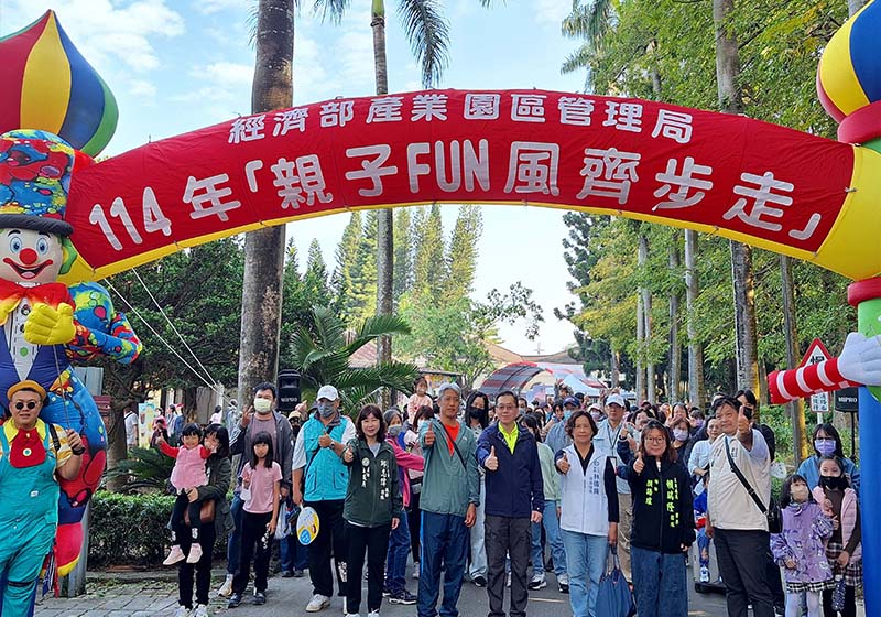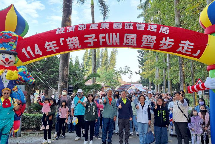 經濟部產業園區管理局「親子FUN風齊步走」健走活動12月6日在橋頭糖廠舉行,從業人員及眷屬逾600人參與健走、趣味遊戲與互動體驗,園管局局長楊志清(圖右四)、勞資關係協進會理事長楊明龍(圖左二)等人到場,主辦單位表示,遊戲融入性別平等、職場安全、政風清廉等觀念,過程穿插宣導防詐,提醒中央不會透過簡訊及電通知領取全民普發萬元現金或要求轉帳,現場同步規劃親子手作、魔術、小丑氣球表演等,完成健走民眾可獲餐盒及運動飲料,尾聲法令知識王吸引大小朋友上網搶答。圖/園管局提供、文/高培德