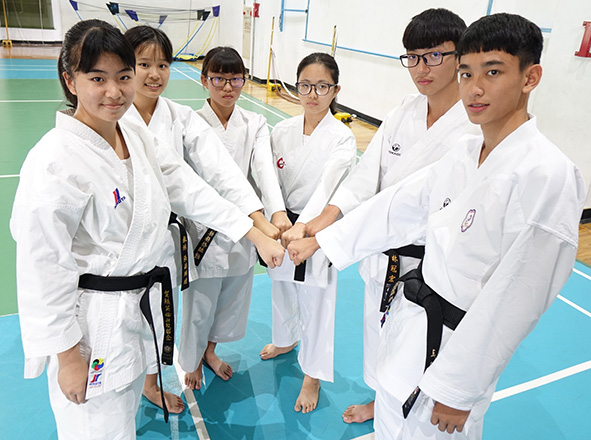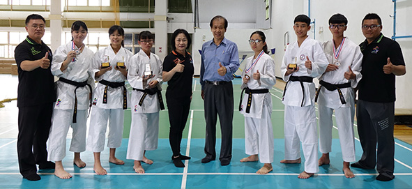 林昭億指出,顏英倫、黃昱儒、陳佳慧、陳佩嫆、林冠宏、王凡杰(圖一由左至右)等6名奪金選手,各自選讀擇觀光、美容、餐飲及應用英語等科,校方安排每天課後及週一至週六放學團練,感謝教練張赫麟(圖二右一)、顏成業(圖二左一)及高市體育會空手道委員會主委陳淑純(圖二左五)支持協助,造就選手優異表現。