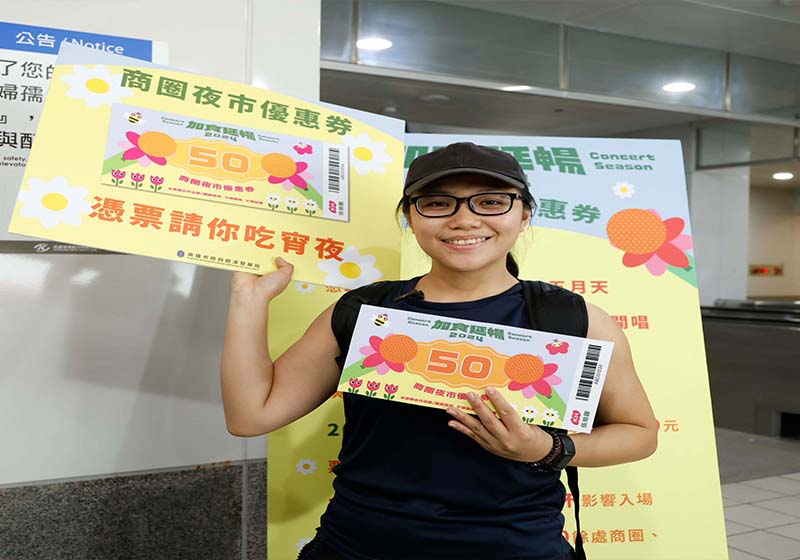 第一屆高雄櫻花季吸引6萬人進場,加上天團五月天成軍25週年、大港開唱音樂祭等大型音樂活動,4月喜迎多組人氣韓國團體接力登台,高市經發局續推2024商圈夜市優惠券,憑演唱會門票可至高雄捷運高鐵左營、巨蛋、美麗島、高雄車站、三多商圈、鹽埕埔等6站兌換面額50元商圈夜市優惠券一張。經發局長廖泰翔說,配合演唱會推加食延暢專案引起廣大迴響,中北部遊客兌換優惠券最多,外籍歌迷新加坡、馬來西亞等地居多數。