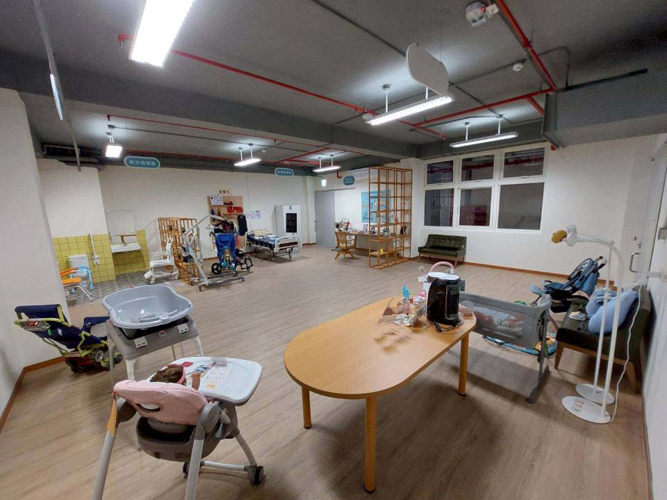 育兒輔具情境區展示自動泡奶機、雙視書、嬰兒床邊床、可調式洗澡盆、寶寶攝影機等,滿足身障家長及照顧者需求。