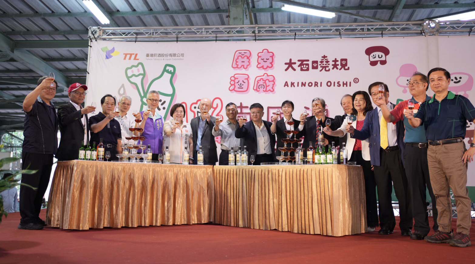 屏東酒廠「南國酒窩在屏酒」102週年慶暨第12屆蓬萊盃全國調酒暨托盤咖啡大賽11月8日舉行,邀請日本知名藝術家大石曉規(Akinori Oishi)指導瓶標創作坊,民眾體驗創作專屬酒標樂趣,兩場開放報名秒殺額滿,大石曉規彩繪牆進駐產品推廣中心,吸引遊客駐足拍照,當日單筆消費滿1500元可獲酒廠與大石曉規聯名帆布袋一只,上午11點30分至下午1點、下午3點30分至4點30 分開放排隊索取大石曉規手繪帆布袋機會,單筆消費滿500元送聯名壓克力鑰匙圈,可可風味蘭姆酒加梅子綠燒酒組合贈聯名手機支架一只,滿1500元贈聯名帆布袋。圖/屏東酒廠提供、文/高培德