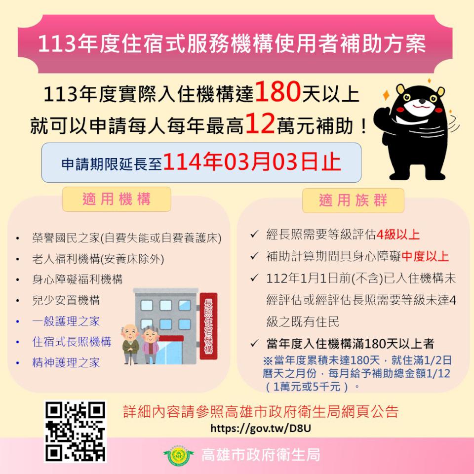 高市社會局與衛生局113年7月1日至12月31日及114年1月1日至3月3日兩階段受理申請當年度住宿式服務機構使用者補助,根據統計,截至12月31日,累計2130人申請,其中一般、精神護理之家、老人福利機構(安養床除外)、身心障礙福利機構、國軍退除役官兵輔導委員會榮民之家(自費失能養護床、自費失智養護床)、兒童及少年安置及教養機構、住宿式服務長期照顧服務機構,經高市長照管理中心評估長照達4級或補助計算期間領有中、重度身障證明,113年1月起入住滿180天(機構喘息服務期間除外)每人補助12萬元。111年12月31日前入住機構且113年累計滿180天者,未經長照管理中心評估或經評估長照未達4級每人補助6萬元,另符合前兩項條件者,如113年入住累計未滿180天,逐月檢核天數,其中連續住滿二分之一每月補助10000元或5000元。提醒符合資格者檢附收據、契約書等相關文件提出申請,洽詢電話長照專線 1966 、(07)7131500分機1715 、(07)3368333分機2448 。圖/衛生局提供、文/高培德