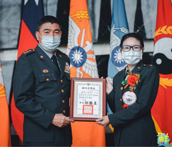 國防部表揚110年全民國防教育傑出貢獻獎,高市教育局校園安全事務室、高市警察局獲頒傑出貢獻團體獎、路竹區公所里幹事陳銘清、教育局校安室教官江幸甄(圖一右)、高餐大附中教官王美文、大榮中學教官郭正武、海青工商教官蕭一勝並列傑出貢獻個人獎,獲獎數排名全台首位,締造三連霸紀錄,其中榮膺傑出貢獻獎教官江幸甄致贈帶領樹德家商學生取材防疫及國防教育設計口罩,慰勉官兵防疫辛勞。