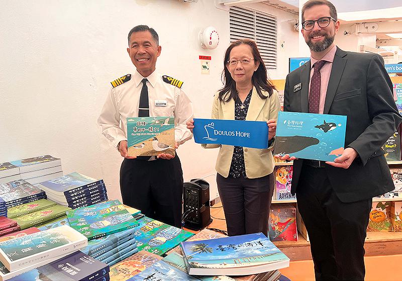 德國非牟利慈善機構好書共享協會(GBA Ships)經營管理、號稱世界最大海上書展船「望僕號」12月18日至114年1月12日停泊高雄港,開放登艦參觀及選購科學、醫學、藝術、語言、信仰、興趣、烹飪、運動等類超過2000冊書籍,海洋委員會副主委黃向文(圖一中)、望僕號船長Jay De Guzman(圖一右)、執行長Nathan Schmutz(圖一左)、臺灣高雄港務處長郭光輝、牧師陳見岳、蔡宗勲等人出席開幕活動,黃向文代表致贈船方海洋保育署與國家海洋研究院等單位出版《發現我的海洋DNA》、《南沙太平島常見大型藻類圖鑑》、《臺灣百種海洋生物》系列、海洋繪本《臺灣鯨讚》、《小海龜的逆襲》等20種320本精選書,她說,望樸號姊妹船忠僕號(MV Doulos)與望道號(MV Logos Hope)曾多次訪台,促進知識文化交流。