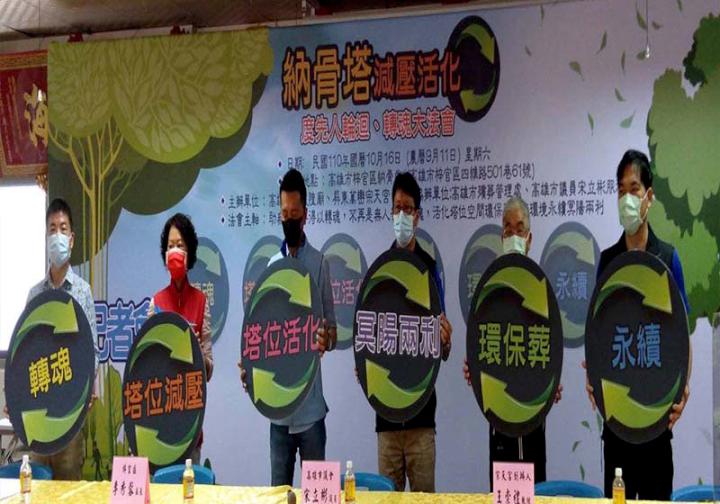 高市民政局殯葬管理處10月16日攜手高雄梓官城隍廟與屏東萬巒宗天宮在梓官區納骨堂合辦納骨塔減壓活化、度先人輪迴、轉魂大法會,藉由宗教轉魂儀式超渡562座無主骨灰後施作環保樹葬,並安置杉林生命紀念園區,高市殯管處、高雄梓官城隍廟、屏東萬巒宗天宮等單位代表10月9日參與宣傳活動,向外界宣告原納骨塔位經誦經灑淨後開放各界申請安葬先人,落實環境永續目的。