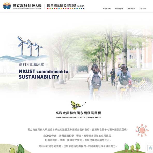 國立高雄科技大學2021年三校合併邁入第4年,校方首度出版《2020永續發展報告書》(Sustainability Report),聚焦聯合國永續發展目標(SDGs)第4項優質教育、第8項良好工作及經濟發展、第9項工業化、創新及基礎建設、第10項消弭不平等、第11項永續城市與社區、第 14項海洋生態,揭示教學、研究、環境、社會參與、治理面向等成果績效,宣示投入永續發展決心,並擘劃2030年永續發展藍圖,透過教學、研究、產學、校園建設等,續落實聯合國永續發展目標(SDGs)17項指標,預計2028年達標碳中和。