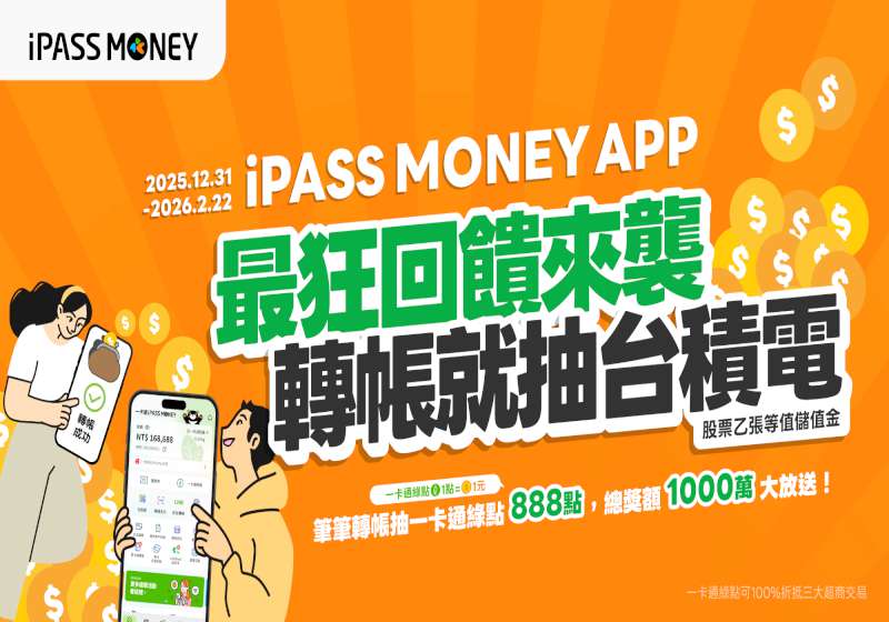 一卡通 iPASS MONEY 電子支付服務移轉手機APP 進入最後倒數,屆時完整保留用戶帳戶餘額、轉帳及繳費功能,同步升級介面功能,12 月 31 日至 2026 年 2 月 22 日好運轉轉樂,使用手機APP 指定轉帳任一筆不限金額,轉帳及收款方可獲抽獎機會一次,每名用戶最多累計30次,有機會抽中最大獎一卡通綠點 888 點,總額達市值1000萬元,另常用轉帳清單儲存滿3名好友及完成指定轉帳,還有機會抽中科技大廠股票等值儲值金,每名用戶最多累計30次,期間使用iPASS MONEY 消費累計滿 100 元加贈抽獎機會一次,預計2026 年 3 月 10 日公布中獎名單。
