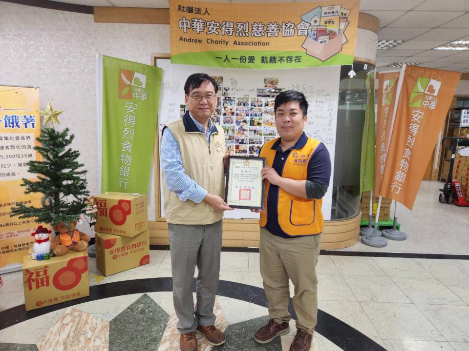 ▲高雄市榮服處處長劉雅魁(左)致贈安得烈慈善協會感謝獎,由導督長王煇廸 (右)代表受贈