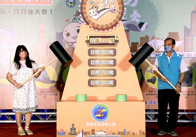 高市勞工局副局長陳石圍(圖一右)、知名插畫家彎彎(圖一左) 4月22日齊聚高雄捷運美麗島站光之穹頂大廳手持大槌道具敲下按鈕,宣示合推「摩力雙重奏」視障按摩消費滿額抽獎活動達標營業額2000萬元,5月1日至7月31日前往全市70家視障按摩據點單筆消費滿300元可獲抽獎機會一次,6月10日、7月11日、8月10日公開抽出電動機車、平板電腦、最新智慧型手機、智慧手錶、吸塵器、藍牙耳機、空氣清淨機、超商1000元禮券、600元視障按摩體驗券等195項獎品幸運得主,現場同步安排輔英科技大學啦啦隊、勞工局星光種子培訓班出身視障歌手呂湘婷、朱禹豪等藝人團體輪流登台獻藝,炒熱活動氣氛。圖/港都慶聯有線電視提供、文/高培德