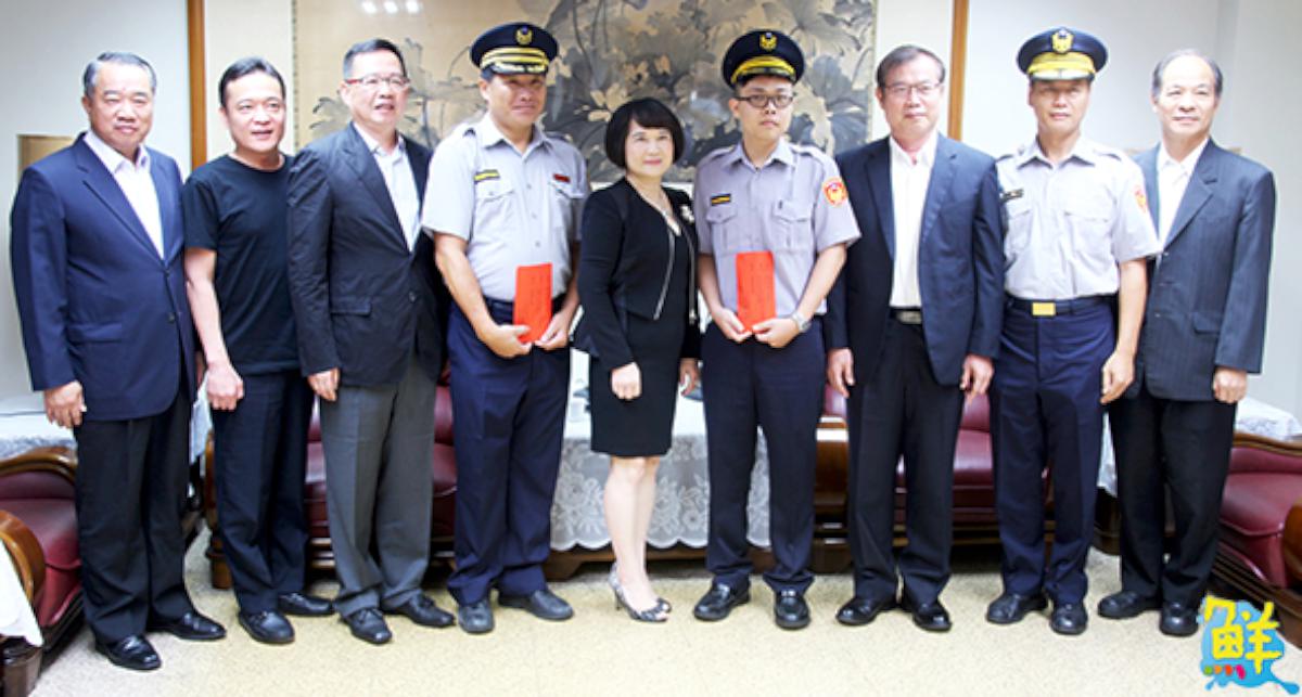 高市林姓男子(41歲、毒品等前科)10月26日凌晨1點多駕車行經鳳山區林森路口見巡邏警車,心虛轉進小巷加速逃逸,後遇死巷棄車竊取單車代步,逃逸過程朝警方連開3槍示威,第3發卡彈未擊發,所幸未造成人員傷亡,鳳山分局五甲派出所所長吳明忠、警員郭晉宏上前壓制逮人,在林男身上查獲改造手槍1把、子彈6發、海洛因一包(28.9公克)及現金10萬元,高市港都警察之友副理事長謝龍隱(圖一左)、陳莊美本(圖二左)代表理事長黃清山頒贈兩警各10萬元獎金,表彰主動積極偵破案件,維護治安有功,鳳山分局長李謀旺等人見證,值得一提的是,逮捕毒販當天恰巧是鄭明忠48歲生日,市警局長李永癸允諾破格晉升2名員警。圖與文/高培德