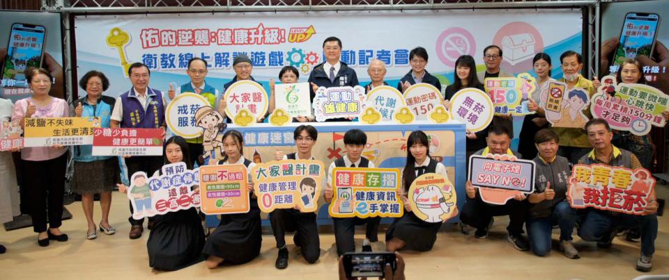 高市副市長羅達生、衛生局黃志中、教育局長吳立森、青年局長林楷軒、高市醫師、營養師、藥師公會代表等人開啟道具鑰匙取出健康寶石,歡喜宣布衛生局自力開發「佑的逆襲:健康升級!」互動衛教解謎遊戲正式上線,寓教於樂宣導電子煙危害、大家醫計畫、代謝症候群、運動健康、營養健康等觀念,即日起至12月31日成功闖關並填寫問卷,有機會抽中知名日系原創IP套組、禮券、藍牙耳機、行動電源等好禮。