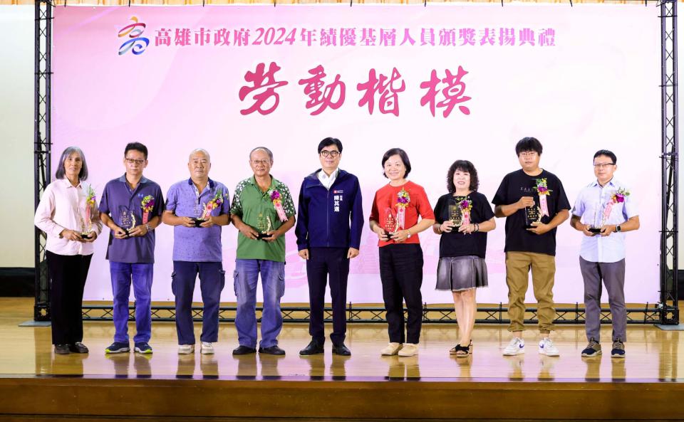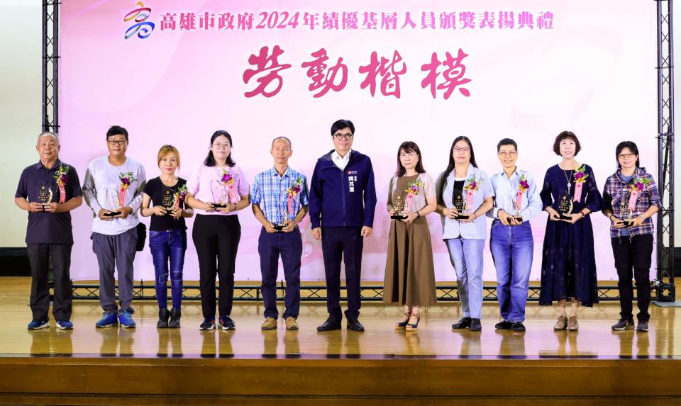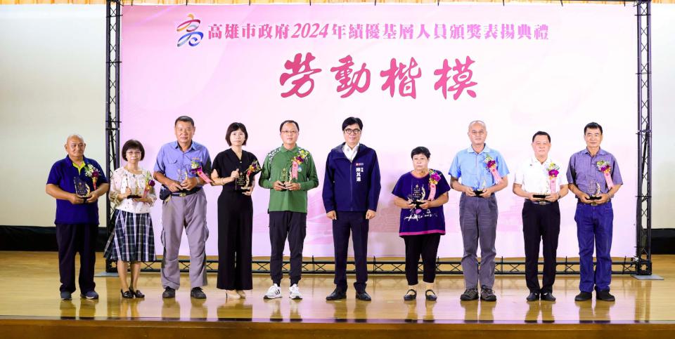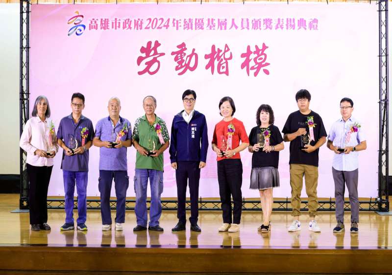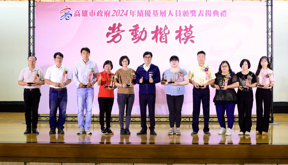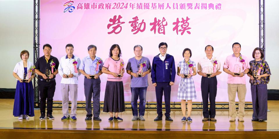 高市行政暨國際處7月8日舉行2024年高雄市績優基層人員頒獎表揚典禮,35名職工及15名臨時人員獲獎,市長陳其邁肯定並感謝工友、技工、駕駛、測量助理、清潔隊員、臨時人員等辛勞付出,市政表現獲得市民認同支持,受獎同仁從近9000人中勝出,實屬不易。