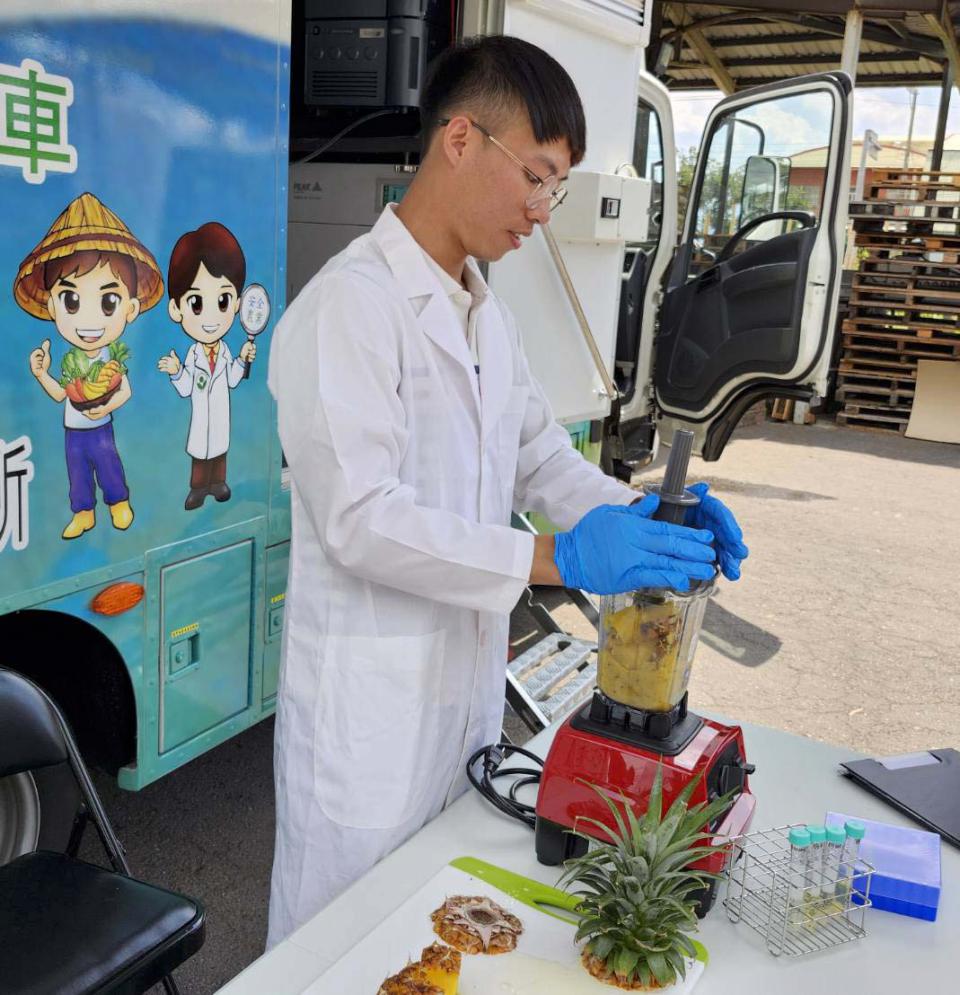 大樹區果樹產銷第13班班長尤峻領軍班員攜帶鳳梨送檢,他說,過去送驗耗費時間成本,貼心服務省時便利,助益良多。