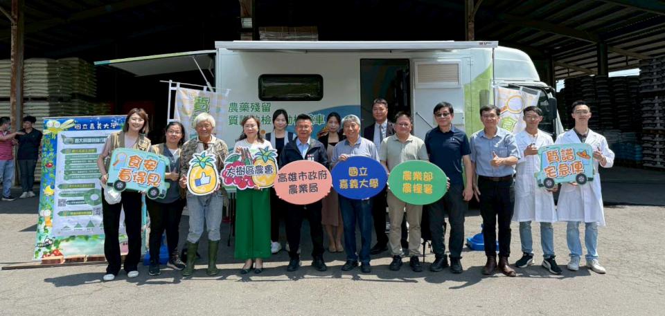 高市農業局與農業部農糧署、國立嘉義大學領先全台合推質譜宅急便免費快檢巡迴服務,5月5日首站開抵大樹區農會姑山集貨場,農業局長姚志旺、農糧署南區分署高雄辦事處主任陳士成、嘉義大學植物醫學系教授郭章信、大樹區農會總幹事歐幸娟等人到場關心,籲請農友把握5月29日截止時間善用資源,守護農產安全。