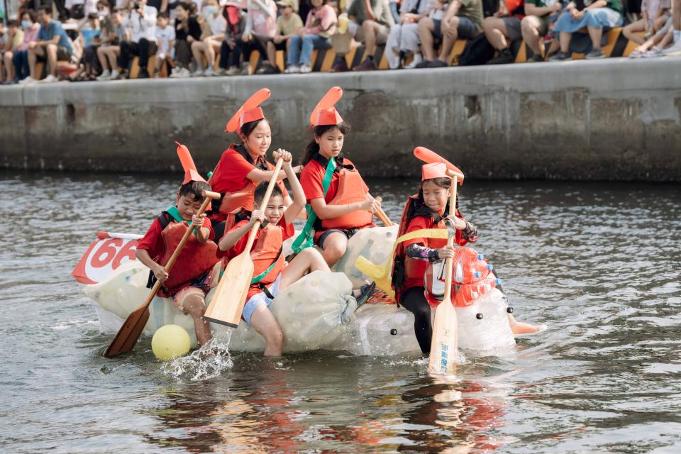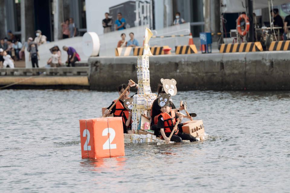 「這是我們從小開始喝的」(圖三)回收牛奶瓶造筏,全家動員完賽,「王家NO.1」(圖四)雖出師不利,但仍守福船筏越過終點線,精神可嘉,5名國際學校學生組成「大腸包小腸」利用寶特瓶浮力完賽,桃園市「木頭人」打造兼具實用及美感船筏勇奪創意造型獎冠軍家庭組「同心協力」回收廢材製作參賽,拿下環保永續獎冠軍,「沈船股份有限公司」榮獲最佳人氣獎第一名。