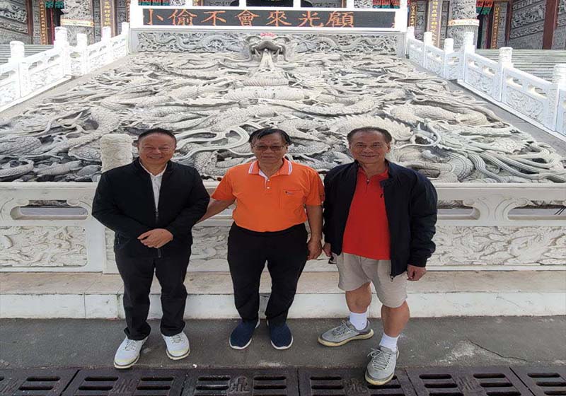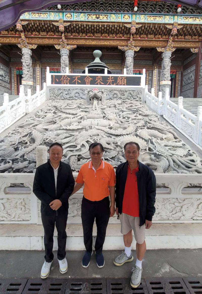 前國際獅子會台灣總會議長黃明聰(圖右)103年高雄石化氣爆募資約9000萬元添購13輛消防車捐贈高市消防局, 認助覆鼎金保安宮320萬元,並商請京典石材董事長鄭楊慶(圖左)派員管理維護殿外九龍戲水御路,用行動支持現任第13屆董事長胞弟黃明華(圖中),長12公尺、寬7公尺九龍戲水御路力邀石雕大師蔡李順費時約4年打造。