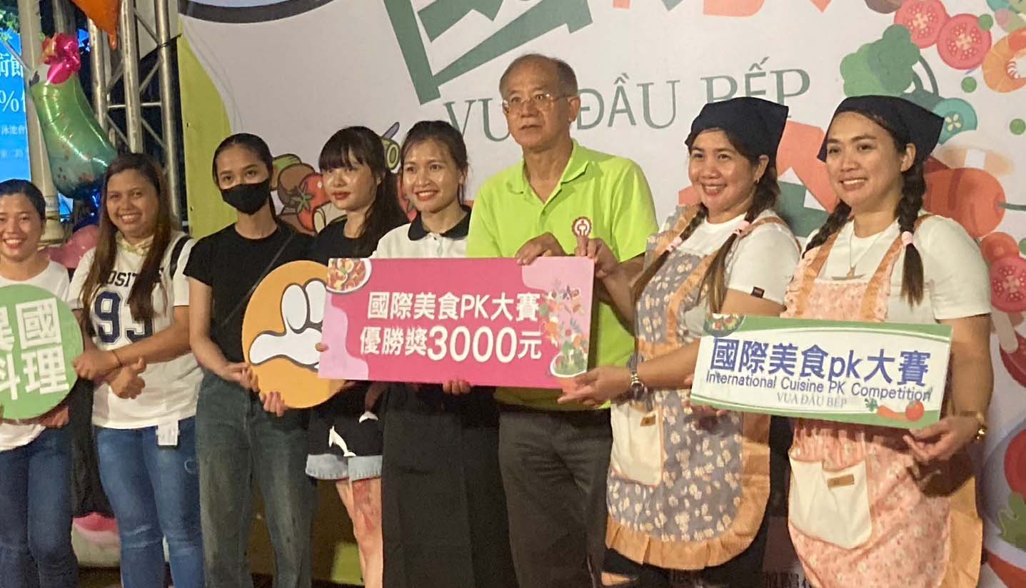 高市勞工局國際美食PK大賽9月21日在凹子底森林公園舉行,越南特色蝦子料理「越夏蝦之戀」拿下優勝,接受勞工局副局長陳石圍頒獎表揚,另「Taste Bud’s」、「港味台咖」、「家鄉味春捲」、「柚柚越夏蝦」、「Lite-on chef」「Dancing Kuzinera’s」等菲律賓及越南料理也深獲評審及試吃民眾青睞,勞工局長江健興說,高雄擁有豐富景觀與文化底蘊,同時匯集多元產業及勞動力,旅宿飯店、連鎖餐飲、夜市小吃、巷弄美食,成為市民及勞工最愛,感謝泰國貿易經濟辦事處高雄勞工處處長陳燦榮、副處長張偉、馬尼拉經濟文化辨事處菲律賓駐台代表處高雄分處勞工副主任艾德華多等人參與,主辦單位現場設置台灣甜滋味手作區,邀請專業烘焙師示範教做棉花糖及糖葫蘆。圖/勞工局提供、文/高培德