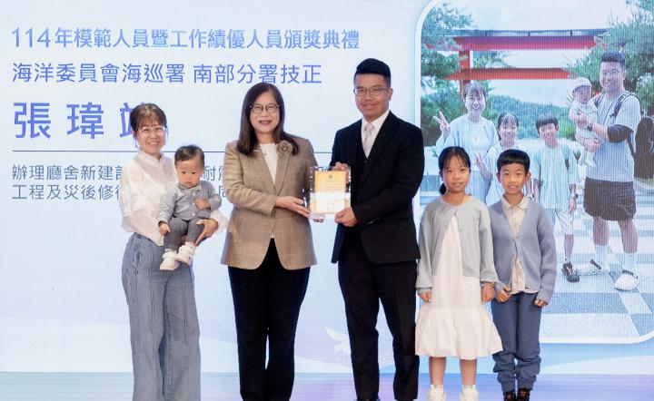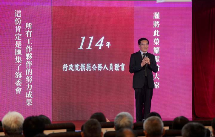 海洋委員會12月12日舉行114年模範人員暨工作績優人員頒獎典禮,主委管碧玲嘉勉模範人員13名、工作績優人員47名,盛讚獲獎人員完成不平凡事物典範,足堪同仁楷模,海委會副主委、海巡署署長張忠龍(圖三)也受邀主講「年長與少年的貼心話」,分享從業心得及工作體悟,他說,獲選全國模範公務人員歸功同仁努力。圖/海委會提供、文/高培德