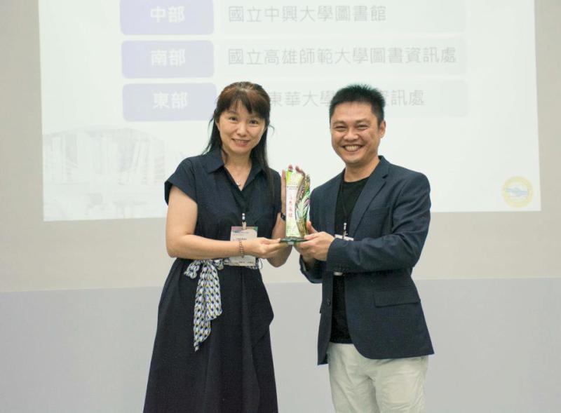 中華圖書資訊館際合作協會8月18日委託國立高雄師範大學辦理第16屆第2次會員大會,主題定為「圖書館服務跨界結合與服務創新」,高師大校長王政彥、副校長李昭蓉、文學院長李翠玉、圖書資訊處處長余遠澤等人與會,中華圖書資訊館際合作協會理事長邱子恒(圖一左)頒贈高師大圖書資訊處處長余遠澤(圖一右)、新北市圖書館郭宥妘(圖二右)轉介服務獎,與會人員參訪高市圖總館及二期共構承億酒店,並聆聽知名建築師張瑪龍(圖三)分享榮獲2021年建築獎屏東縣立圖書總館設計理念、高市圖代理館長林奕成暢談圖館空間再造、承億酒店公共事務長黃知宥介紹文創旅店跨界整合共構圖書服務,王政彥表示,高師大圖書館轉型朝多元及智慧化發展,舉例和平校區愛閱館引進輕食,打造友善使用者複合式閱讀空間。