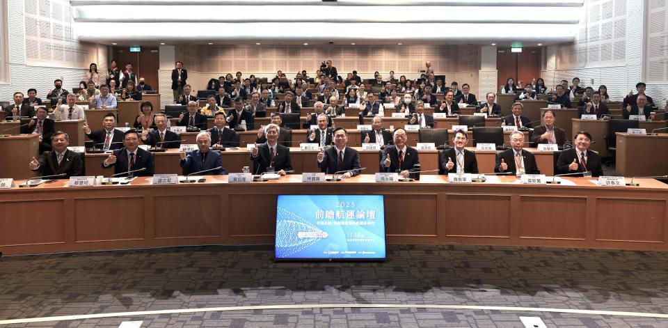 交通部航港局11月18日舉行2025年前瞻航運論壇,主題定為「引領永續、共融與智慧的航運新時代」,產官學研界海運相關代表商討淨零永續、無人智慧、人才培育等議題,擘劃航運產業未來藍圖,交通部次長林國顯(圖一前排左七)、航政司司長韓振華(圖一前排左二)、航港局長葉協隆(圖一前排左六)、臺灣港務董事長周永暉(圖一前排右五)、臺灣高雄港務總經理王錦榮(圖一前排右四)、運研所所長黃新薰(圖一前排左四)、船舶中心董事長邱逢琛(圖一前排左一)、陽明董事長蔡豐明(圖一前排左三)、海洋大學校長許泰文(圖一前排右三)、勞氏總經理呂芳儀(圖一前排右二)、驗船中心執行長鄭志文(圖一前排右一)、前長榮暨陽明董事長謝志堅(圖一前排左五)、海攬公會理事長陳木枝(圖一後排左一)、萬海航運副總葉文超(圖一後排左二)、船代會理事長黃啟洋(圖一後排左三)、海委會海洋資源處處長吳龍靜 (圖一後排左四)、貨櫃儲運協會理事長林炯炘(圖一後排左五)、海巡署副署長謝慶欽(後排中)、長榮海運本部主管黃崇榮(圖一後排右五)、長榮船訓中心經理白宗原(圖一後排右四)、海員總工會理事長葉慶榮(圖一後排右三)、船舶中心執行長周顯光(圖一後排右二)、台航總經理仇忠林(圖一後排右一)等人合影留念,葉協隆說,航港局108年開辦前瞻航運論壇,聚焦全球海運趨勢脈動,期能邀集各界關注海運前瞻議題,傾聽寶貴建言,作為規劃航運政策參考。圖/航港局提供、文/高培德