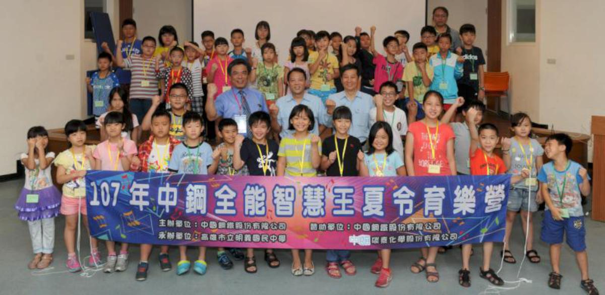 中鋼與中鋼碳素化學7月2日至6日在高市明義國中合辦兩梯次107年中鋼全能智慧王夏令育樂營,吸引小港區100名國小學童報名參與,營隊邀請TLBE管樂團、明義國中管樂團互動學習,並規劃弦樂團音樂話劇表演、舞蹈戲劇教學、達克羅士音樂課、彈珠台木工實作、中鋼集團教育基金會環境教育等課程,其中達克羅士音樂課採用身體經驗構成音樂意識理念,訓練學員美感、創意、表達力與創造力,形塑各領域統整能力與藝文涵養。