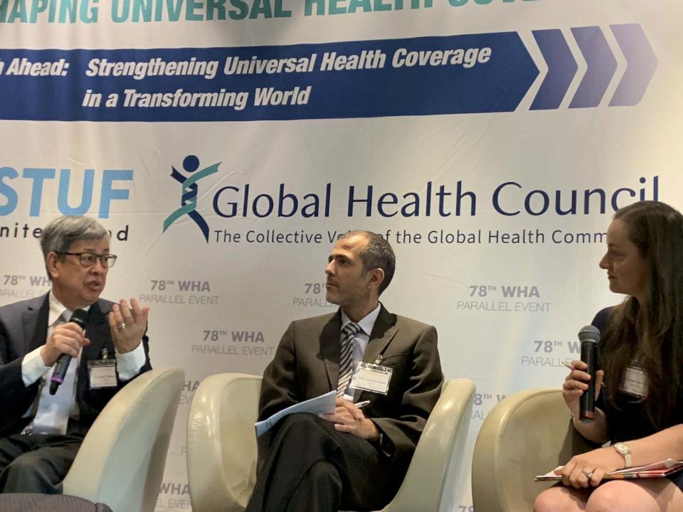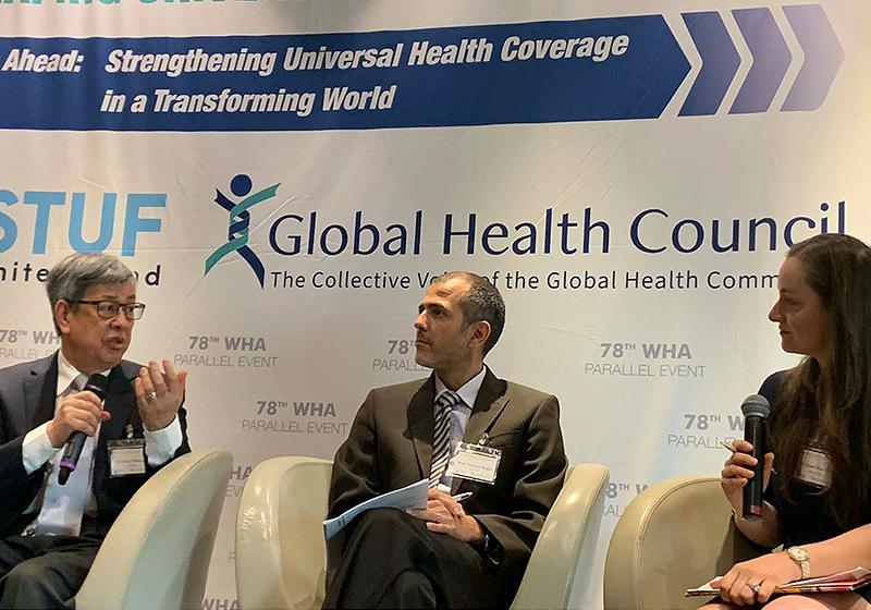 世界衛生大會(WHA)開議期間,世台聯合基金會與全球健康理事會合辦「2025 WHA全球論壇─重塑全民均健(UHC)」5月20日在瑞士日內瓦舉行,全球健康理事會美籍總監Eliana Monteforte主持,規劃國際計劃生育聯盟(IPPF)南亞區外部關係主任Harjyot Khosa「性別健康權與區域合作模式」、非洲地區代表、Speak Up Africa合作與發展總監Yaye Sophiétou Diop「行為改變傳播在提升公共衛生覆蓋率方面的應用與成效」等專題講座,前副總統陳建仁(圖左)、高市文藻外語大學法文系法籍教授羅文笙(Vincent Rollet)(圖中)也受邀擔任講者,羅文笙探討歐盟現行制度促進全民均健過程角色,並結合研究觀察,為台灣公共衛生發聲。