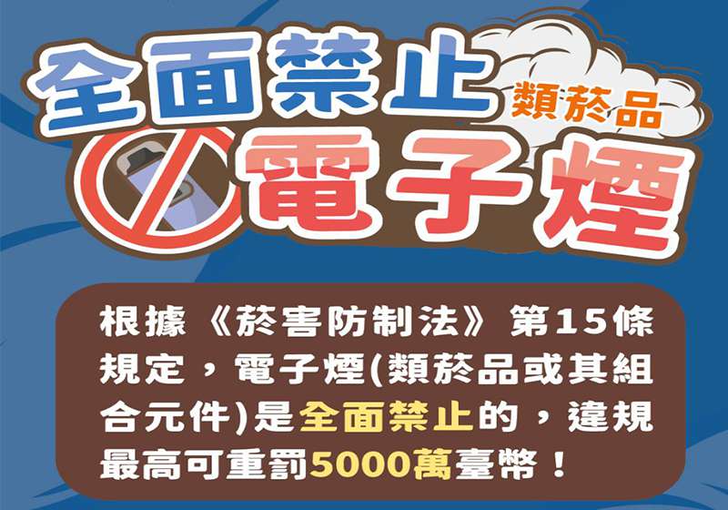 衛生局表示,112年3月22日修訂菸害防制法,電子煙歸類類菸品,並明文禁止製造、輸入、販售、供應、展示、廣告,違法最高可處5000萬元罰鍰,社群分享、轉傳相關資訊,最高可處100萬元罰鍰。