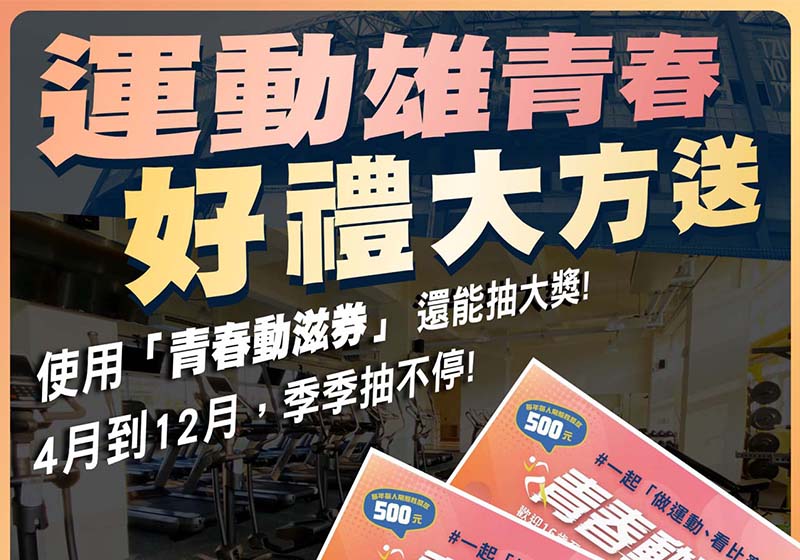 教育部體育署112年6月1日起發行面額500元青春動滋券,鼓勵16歲至22歲青年規律運動,高市運動發展局推出「運動雄青春‧好禮大方送」活動,憑券前往合作店家消費,不限金額每季抽出電動輔助自行車、知本酒店住宿券、折疊自行車、碳纖維輪組等16項好禮,未中獎者機會可累計下次至活動截止。