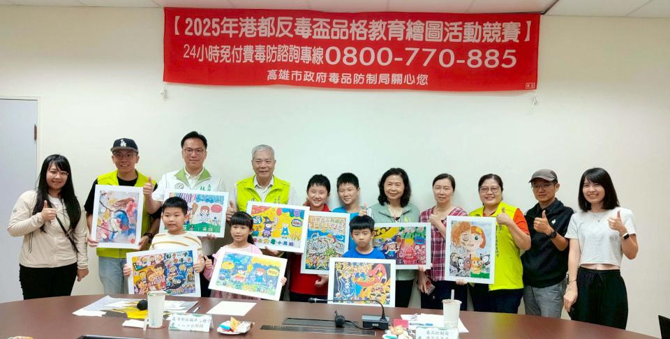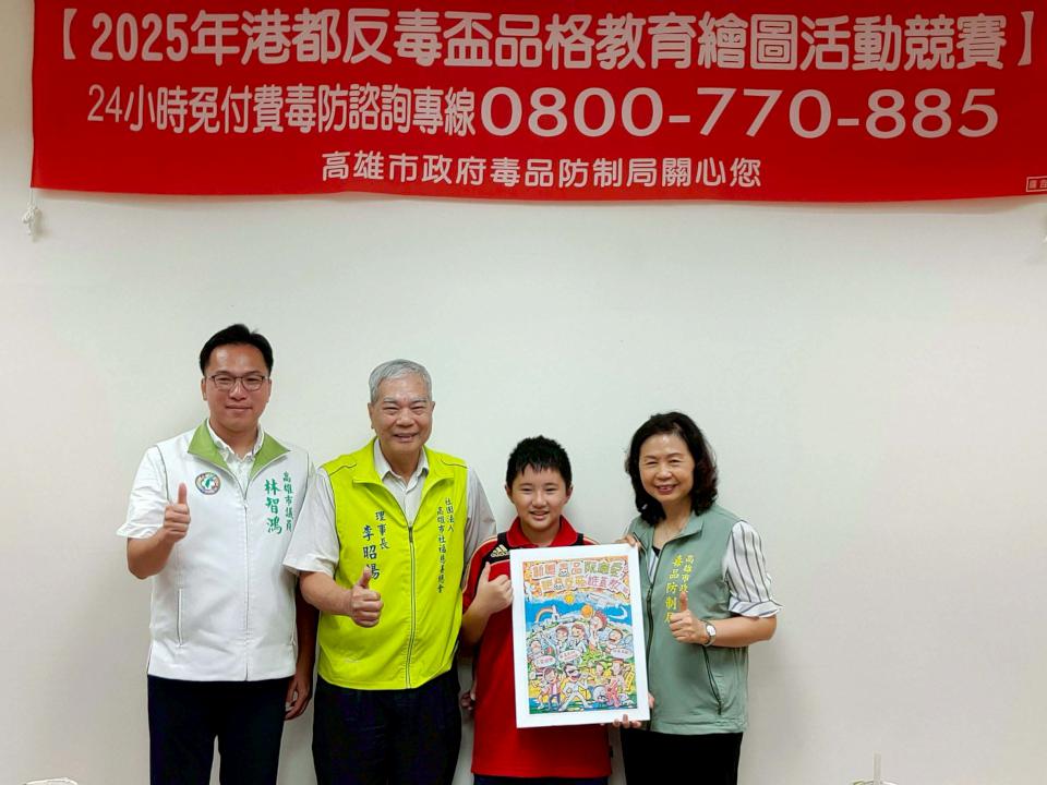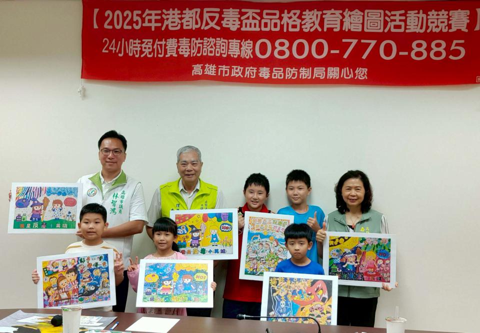 高市毒品防制局攜手高市社福慈善總會、市議員林智鴻服務處合辦2025年港都反毒盃品格教育繪圖活動競賽即日起至10月24日受理報名,毒防局長陳盈秀、高市社福慈總理事長李昭揚、市議員林智鴻等人8月22日領軍洪唯宸、楊沐辰、楊沐穎、林可晉等反毒小畫家齊聲宣示「我反毒,我驕傲!」,其中2024年反毒繪畫比賽第一名洪唯宸受邀分享創作理念與參賽心得,陳盈秀說,樂意結合高市社福慈總,邀請反毒小畫家分享創作意涵,展現創意同時賦予榮譽感,透過大小朋友宣示反毒決心,紮根校園反毒教育,更多繪圖競賽資訊可上高市社福慈總官方社群查詢。圖/毒防局提供、文/高培德