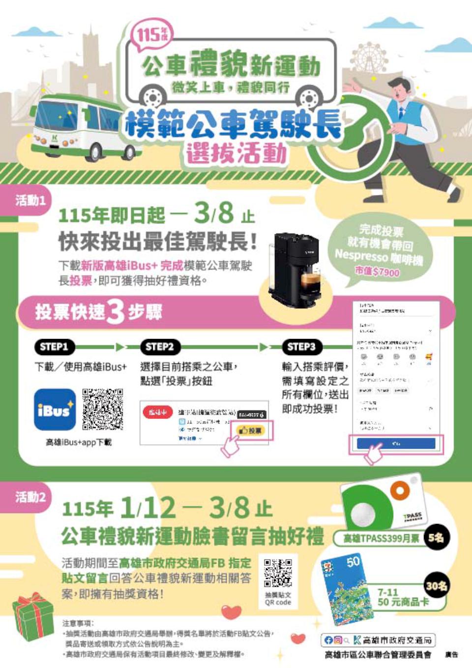 高市交通局「公車禮貌新運動—微笑上路,禮貌同行」115年模範公車駕駛長選拔活動即日起至3月8日起跑,上高雄iBus+公車動態APP查詢公車路線動態及評價,填妥資料完成投票,每天最多2次,有機會抽中咖啡機、限定版高雄公車曬娃包、TPASS高雄市區通勤月票、商品禮券等好禮,票數最多前14名可獲模範公車駕駛長獎盃、獎狀及6000元獎金,前20名入圍者可獲獎狀及1500元獎金,更多資訊可上交通局官網及轉動高雄青春夢官方社群查詢。圖/交通局提供、文/高培德