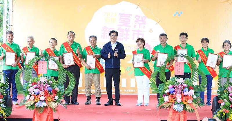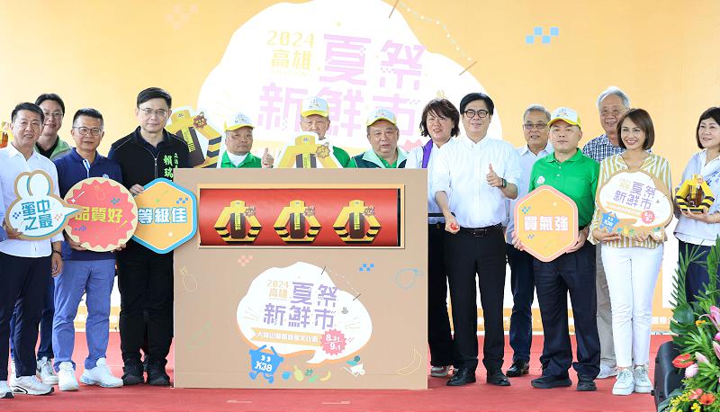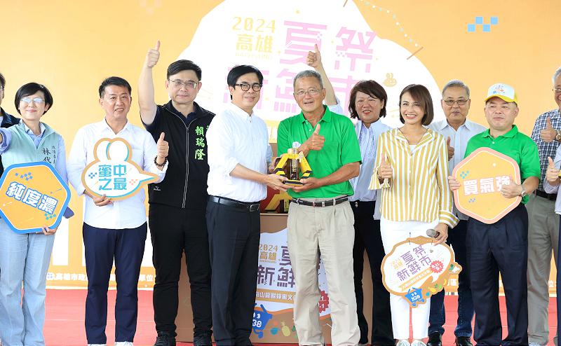高市岡山、田寮、阿蓮區農會輪流主辦2024第24屆夏祭新鮮市大崗山龍眼蜂蜜文化節8月31日在大崗山風景區如意公園旁舉行,市長陳其邁、農業局長張清榮等人手搖拉霸機宣布活動起跑,他也推薦通過兩階段評鑑、無農藥殘留且取得HACCP及ISO22000雙認證龍眼蜂蜜,陳其邁也在特等蜜上署名並喊價競標,高市農會常務監事楊榮南1萬元搶下。
