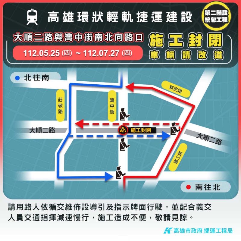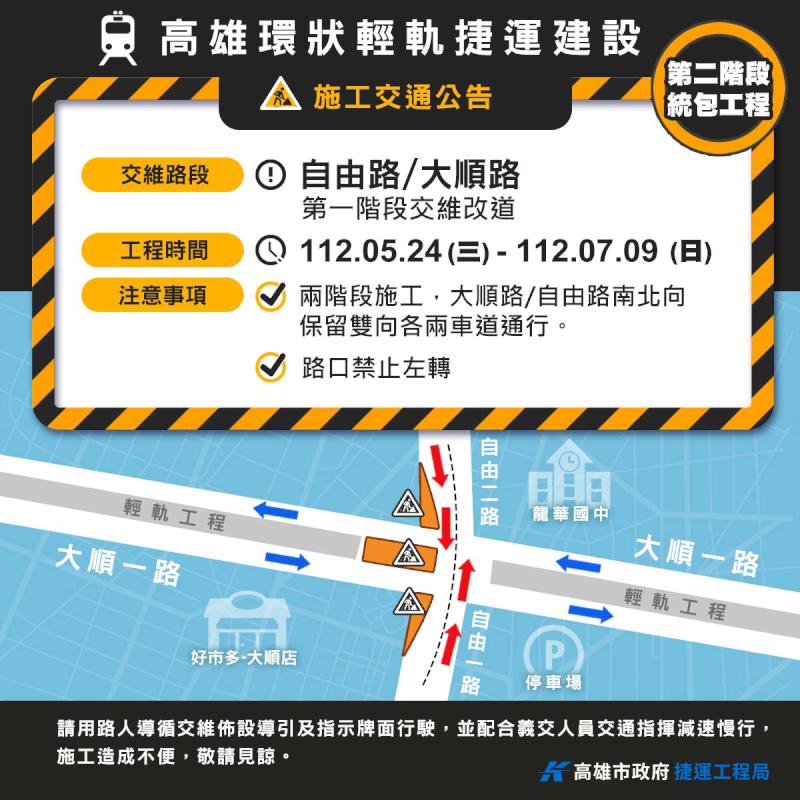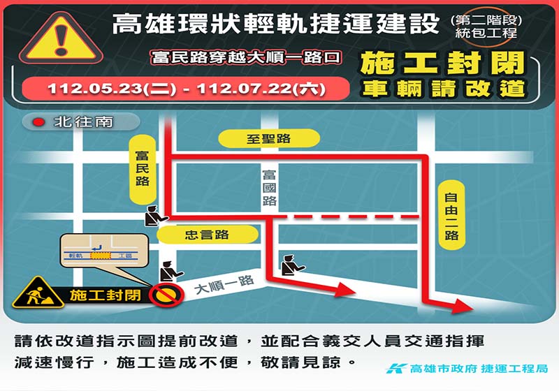 配合高雄環狀輕軌捷運建設第二階段大順路段統包工程,高市捷運局5月23日至7月22日封閉大順一路、富民路口南北向車道施工,期間大順一路東西向車道維持通行, 5月24日至7月9日管制大順一路、自由一路口,自由一路南北向車道維持通行,路口各方向禁止左轉。5月25日至7月27日封閉大順二路、灣中街口南北向車道,期間大順二路東西向車道維持通行。捷運局籲請用路人行經工區減速慢行,並依標誌、標線及交通指揮人員引導通行或提前改道,同時諒察不便,工洽詢捷運局工務管理科(07)3368333分機3823、3831、台灣世曦工程顧問(07)6216753、中鋼(07)7919876。圖/捷運局提供、文/高培德