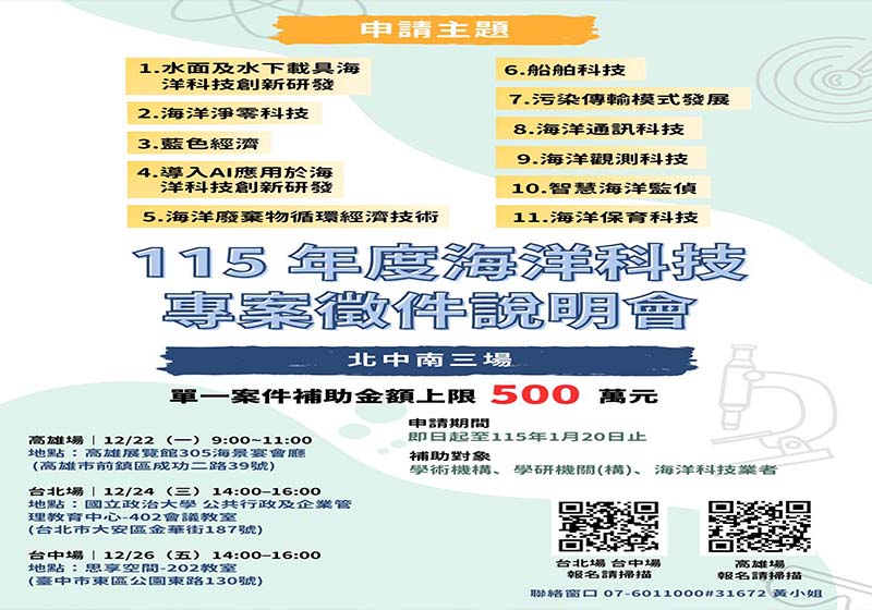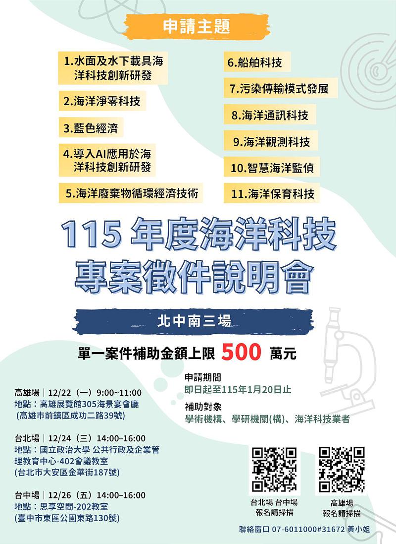 海洋委員會115年度海洋科技專案計畫徵件作業11月24日至115年1月20日受理公私立大專校院、研究及行政法人、海洋科技相關業者等上網報名,擴大補助水面及水下載具創新技術、海洋淨零科技、藍色經濟、導入人工智慧應用創新研發海洋科技、海洋廢棄物循環經濟技術、船舶科技、污染傳輸模式發展、海洋通訊科技、海洋觀測科技、海洋觀測科技、智慧海洋監偵、海洋保育科技等領域專案,12月前進北、中、南辦理3場說明會,首場12月22日在高雄展覽館舉行,同步展示114年海洋科技專案成果,更多資訊可上海委會海洋領域補助案入口網查詢。圖/海委會提供、文/高培德