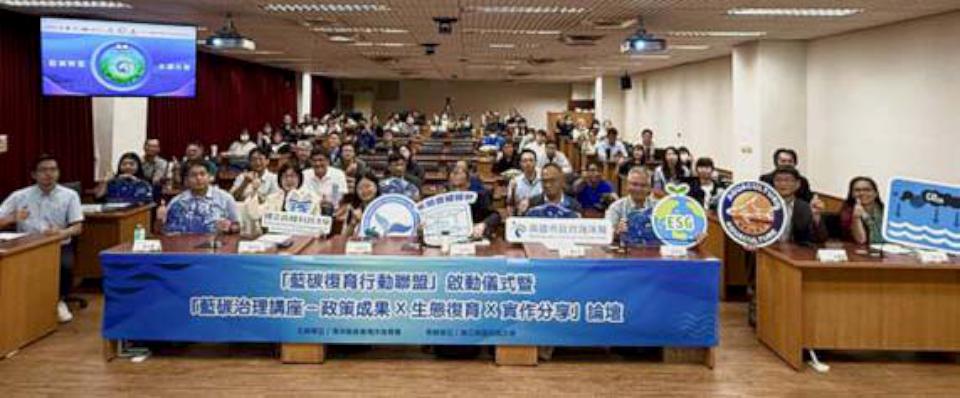 海洋委員會海洋保育署署長陸曉筠等人 11 月 26 日齊聚國立高雄科技大學,宣布串連農業部漁業署、農業部水產試驗所、交通部觀光署大鵬灣國家風景區管理處、高雄市政府、臺南市政府、嘉義縣政府、澎湖縣政府、國立中山大學、國立臺東大學、國立高雄科技大學、國立東華大學等單位藍碳復育行動聯盟正式成軍,海保署也同步辦理「藍碳治理講座-政策成果 × 生態復育 × 實作分享活動」,陸曉筠說, 海委會前進巴西COP30分享藍碳生態系推動成果,發現沿海及島國關注藍碳生態系扮演自然為本解方(Nature-based Solutions)、海岸韌性(Coastal Resilience)、氣候調適(Adaptation)及社會共益(Co-benefits)等角色,台灣近年積極布局藍碳科學量測、治理機制、復育行動,建立藍碳政策科學根基。