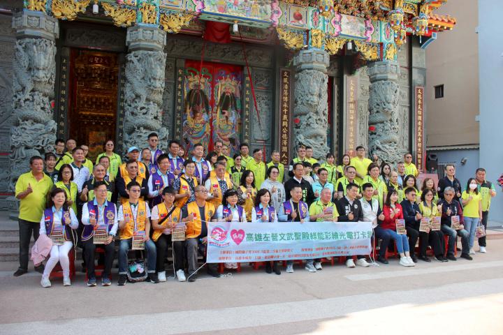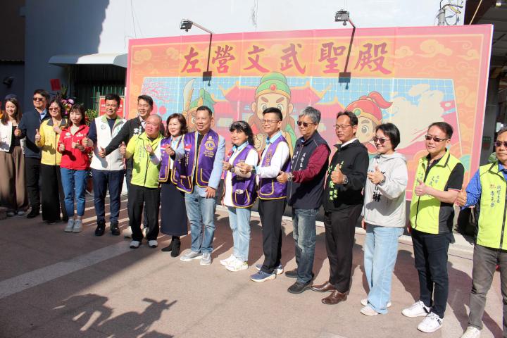 國際獅子會300E3區第三分區主席、高市愛益獅子會會長、在一起永續科技創辦人薛煒立、高市民政局副局長吳淑惠、環保局副局長黃世宏、左營區長蘇平福、睿田能源代表李佳蓉、高雄左營文武聖殿主委陳正誠、立委李柏毅、立委賴瑞隆辦公室執行長林恭正、高市議員李雅慧、黃文志等人1月24日揭下紅綵,歡喜宣布左營文武聖殿綠能彩繪光電打卡牆正式啟用,採用5 片彩繪太陽能板設計,年發電約 3475 度,減排二氧化碳約 1.74公噸,同步設置兼具可體驗、感受、擴散環境教育看板,兼具美學及實用性,薛煒立說,期能推廣淨零從營建工地延伸日常生活,透過地方信仰中心作為起點,帶動各世代族群參與,落實高效社會互動。