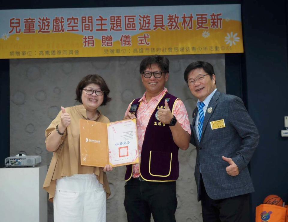 高市高鳳國際同濟會捐資協助社會局婦幼青少年活動中心建置露營風主題角落「秘密基地」6月26日啟用,同步添購繪本及教材遊具,社會局專委何秋菊代表回贈高市高鳳國際同濟會會長周碩康感謝狀,高鳳國際同濟會區主席黃世雄等人歡喜見證,中心孩童票選命名秘密基地,透過遊戲推廣兒童權益公約意涵,捐贈儀式同時也結合高市好事多共融生活推動協會辦理「童言同權—兒童權利親子繪本戲劇活動」,邀請15組親子改編繪本創作。圖/社會局提供、文/高培德