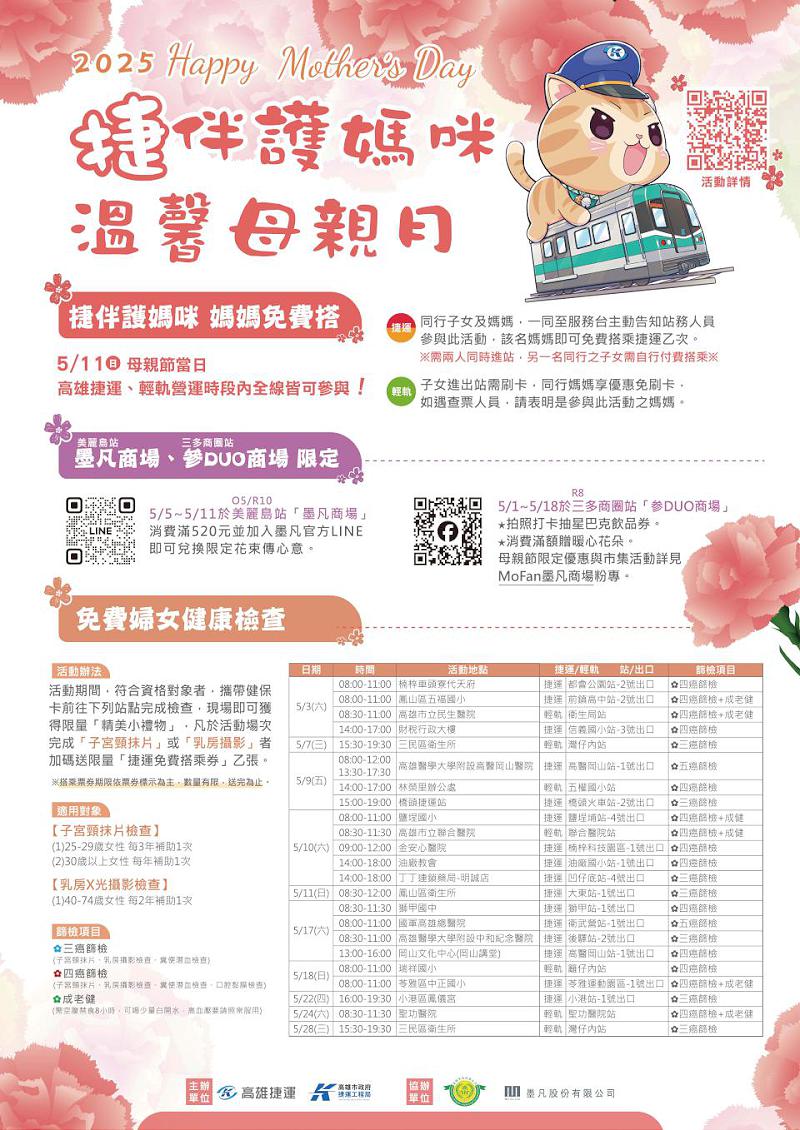 高雄捷運與高市捷運局5月11日合辦捷伴護媽咪活動,陪伴搭乘捷運或輕軌婆媽當次免費,不限起終點,高捷也攜手高市衛生局5月合推23場婦女健檢活動,完成檢查可獲精美小禮及高捷免費搭乘券一張,數量有限,送完為止,高捷美麗島站墨凡美麗島商場與三多商圈站墨凡参DUO商場同步推系列活動,消費滿額贈暖心花朵,上傳合照還有機會抽中連鎖咖啡飲品券。圖/高捷提供、文/高培德