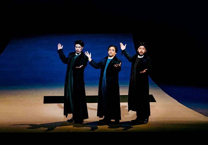 左涵瀛飾演主角杜蘭朵,用兼具抒情、花腔與戲劇特色高音完美詮釋角色,李勇勳演活卡拉富王子深情與勇氣,另結合林玲慧飾演美麗勇敢柳兒、男高音張玉胤詮釋皇帝、男中音蔡文浩演出落難國王帖木兒、吳翰衛、林健吉與黃亞中(圖一由左至右)分飾平、龐、彭思三名大臣、男中音李增銘出演宣旨官。