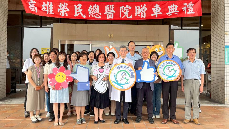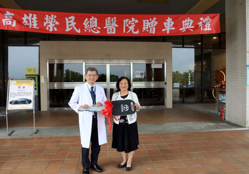 高雄榮總病友方艶娥(圖一右)11月18日捐贈院方醫療巡迴車一輛,回應醫護人員溫情照顧,院長陳金順(圖一左)感謝對方善舉,車上搭載鋰電池油電動力系統,每公升汽油平均可行駛25.3公里,符合淨零排放標準,強化醫療量能同時兼顧環保。圖/高榮提供、文/高培德