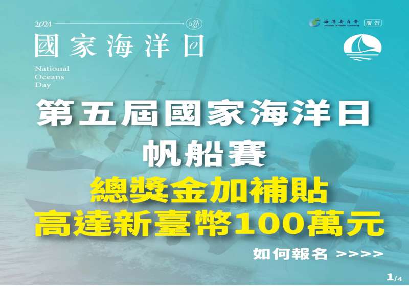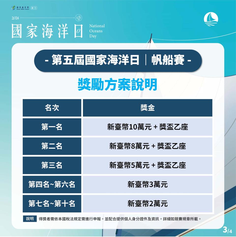 海委會慶祝2024年第五屆國家海洋日 帆船賽第一名獎10萬元補助參賽者油料等費用