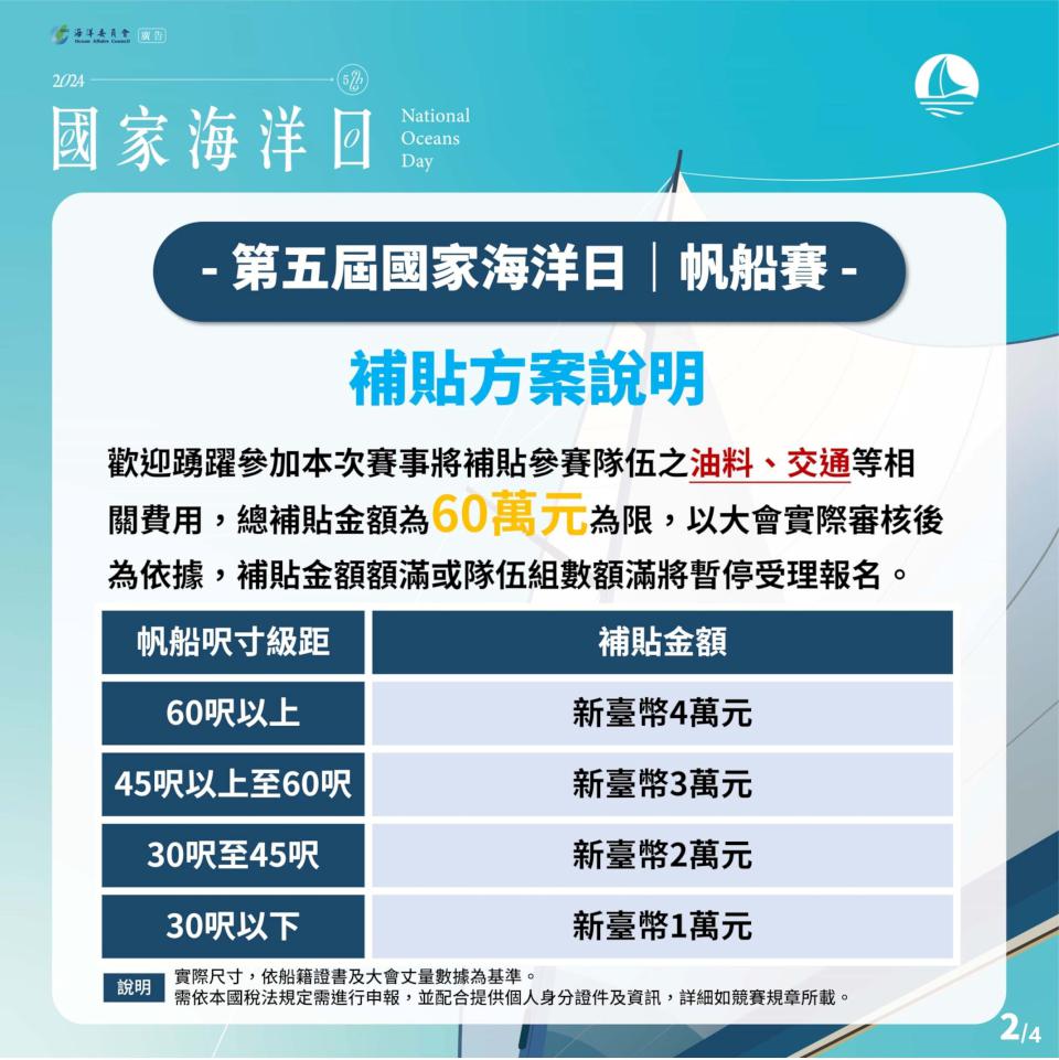 海洋委員會2024第五屆國家海洋日慶祝活動6月15日在高雄港16號、17號碼頭舉行,其中「航海大會師—帆船賽」在高港16、17號碼頭及港外至柴山(左營軍港南邊)等地登場,5月24日下午5點開放免費上網報名,補助參賽者油料、運費及人員等費用,滿60呎帆船4萬元、45呎至60呎3萬元、30呎至45呎2萬元、未滿30呎1萬元,總補助金60萬元,賽事前三名可獲獎盃及5萬至10萬元不等獎金,四至六名獎金3萬元,第七名至十名獎金2萬元,每名完賽選手可獲紀念徽章及航海大會師專屬精美好禮一份,賽後還安排交流饗宴。圖/海委會提供、文/高培德