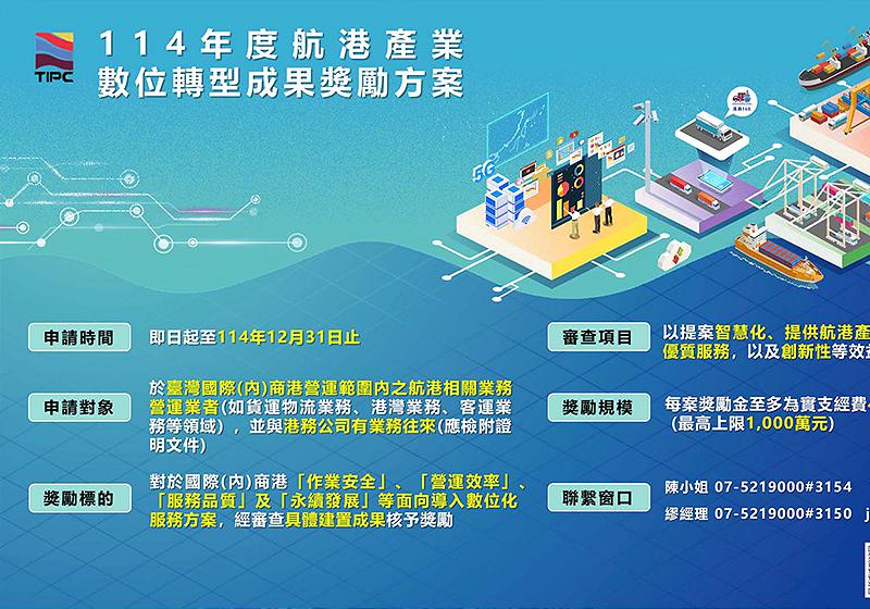 臺灣港務民國114年續推航港產業數位轉型成果獎勵方案,鼓勵航港業者加速推動人工智慧(AI)、物聯網、雲端、大數據等數位科技應用,並擴大補助上限至1000萬元,即日起至12月31日受理申請,臺灣港務110年首推港口數位轉型獎勵方案,吸引導入智慧櫃場管理、智慧倉儲監控巡檢、貨物裝卸作業自動化、進口櫃預約提領作業E化以及櫃場閘口自動化車道建置等11件申請案,帶動投資逾1億2000萬元,相關資訊課上臺灣港務行銷獎勵方案申請平臺查詢或電洽(07)5219000分機3154 陳小姐,電郵T03823@twport.com.tw。圖/臺灣港務提供、文/高培德