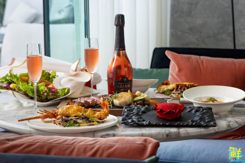 ▲天空酒吧推出情人節海陸饗宴,每組售價5,920元+10_ ,套餐含波士頓龍蝦與爐烤美國肋眼牛排等海陸佳餚,搭配西班牙粉紅氣泡酒,打造浪漫晚宴