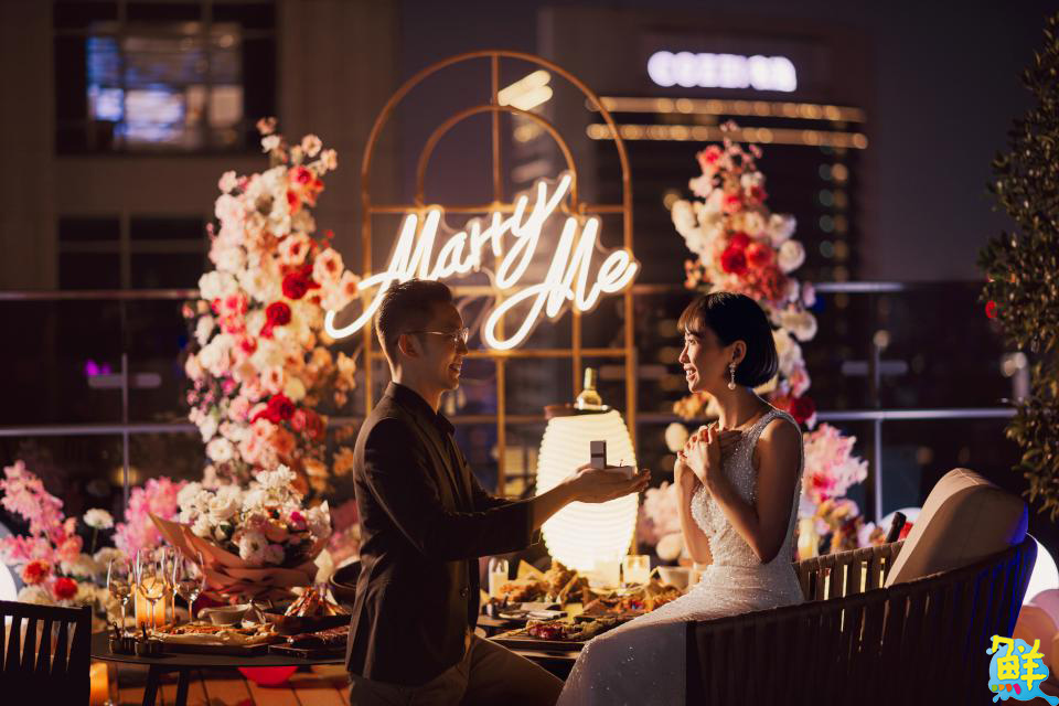 除了雙人世界的甜蜜,高雄日航酒店更打造「Rooftop Bar22求婚派對專案」,專案價28,888元(含服務費),適用10位賓客入場共同見證。專案包含專屬求婚場景佈置與浪漫花束,免去繁瑣的籌備過程,為準新人打造電影場景般的夢幻求婚儀式。