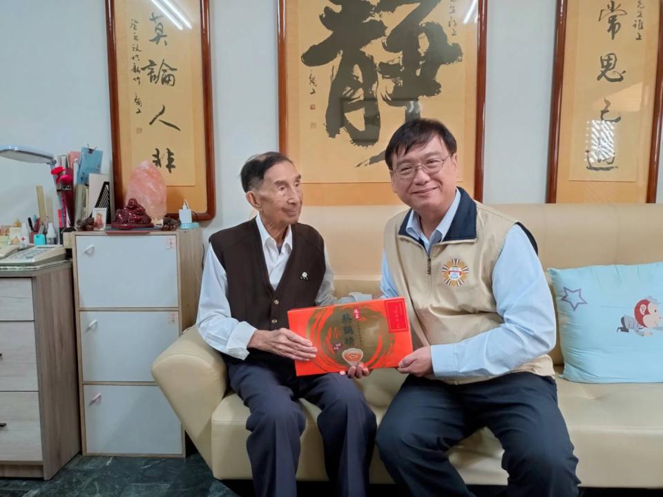 年長榮民何爺爺,已高齡97歲,目前和配偶同住,對處長親自前來關懷,感到很高興並覺得很暖心,劉處長特別提醒近期寒流來襲,記得適時添加衣物保暖及注意筋骨活動安全,並致贈電熱毯和熬雞精,讓長輩感受到榮服處的溫暖關心。