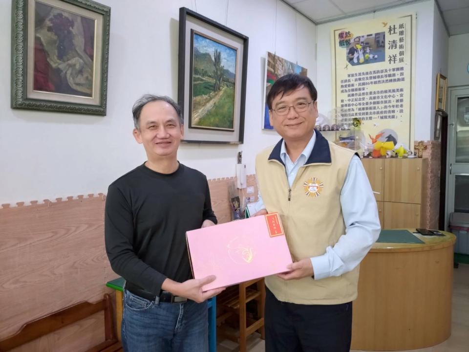 ▲劉雅魁處長(右)拜會榮民紙雕藝術家杜清祥(左)
