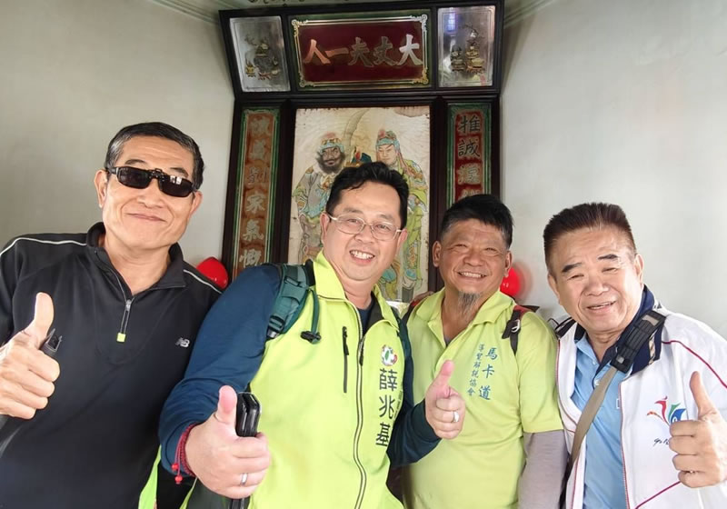 左楠市議員參選人薛兆基日前在啟明堂總幹事洪俊義帶領下,並由高雄市興隆庄文化學會理事長曾錦元、高雄市導覽協會理事長廖德嵩及興隆庄文化學會成員陪同,專程登上春秋閣三樓,實地了解國寶級藝術家潘春源於1952年親手繪製、至今仍懸掛於春秋閣內兩幅畫作。