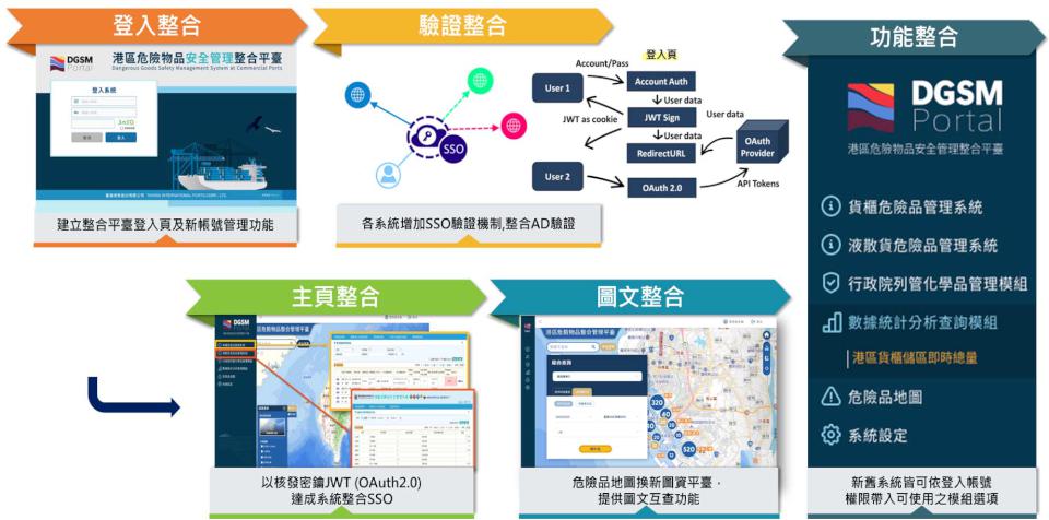 臺灣港務危險物品安全管理資訊系統整合貨櫃、液散貨及危險品地圖等子系統,並透過地圖導向模式及響應式網頁設計,簡化複雜管理資訊,強化使用者體驗,另導入櫃場系統(TOS),精準掌握港區危險品貨櫃存量,便利業者即時回報,解決資訊落差問題。