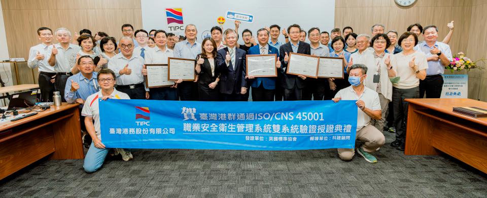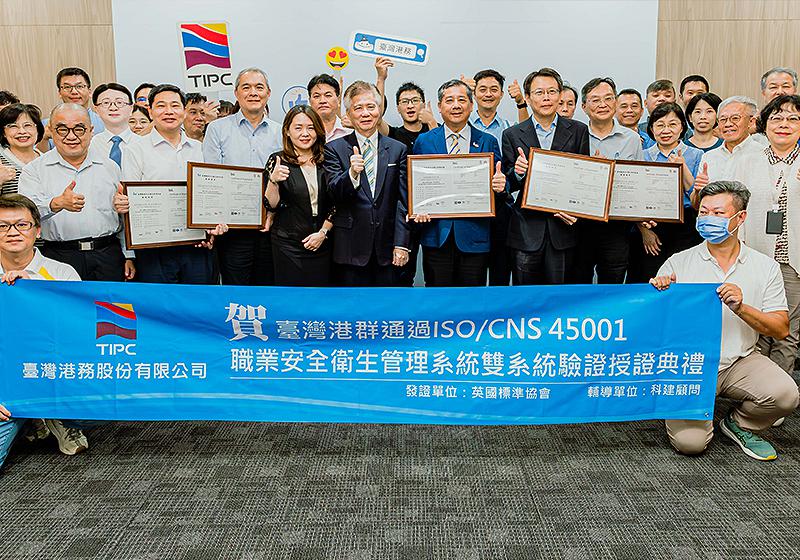 臺灣港務通過ISO與CNS 45001雙系統驗證,總經理王錦榮及高雄、基隆、台中、花蓮港務總經理8月20日代表從英國標準協會(BSI)台灣分公司協理簡慧伶手中接過證書,高市勞工局勞動檢查處處長郭清吉等人歡喜見證,王錦榮說,感謝同仁持續協助優化職業安全衛生系統,促成重新通過雙國際認證,有助帶動企業邁向永續發展,未來續滾動檢討,營造港區安全、員工安家、業者安心就業環境。圖/臺灣港務提供、文/高培德